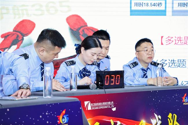 活動(dòng)前夕,公司成立了第二屆“護(hù)航365”籌備組,主動(dòng)對(duì)接省公安廳交管局和各屬地交警支隊(duì)黨委,就活動(dòng)主題、活動(dòng)方案進(jìn)行充分溝通討論,共同選拔支部書(shū)記聯(lián)合組隊(duì)。立足主題教育實(shí)際,建立“目標(biāo)一致、學(xué)習(xí)一體、共創(chuàng)一流”的聯(lián)學(xué)機(jī)制,參賽隊(duì)伍以“讀”為根本、以“訓(xùn)”促提高、以“測(cè)”看成效,根據(jù)活動(dòng)方案積極備賽、集中培訓(xùn)、多輪預(yù)演,共同學(xué)習(xí)、共同檢視、共同提升。來(lái)自杭州北管理中心的參賽選手洪秋亞子談起備戰(zhàn)過(guò)程,“我們成立了打擂小組,每天都在線上進(jìn)行刷題訓(xùn)練,每周開(kāi)展組內(nèi)競(jìng)賽,既是出題人又是答題人,每個(gè)人鉚足了勁。”